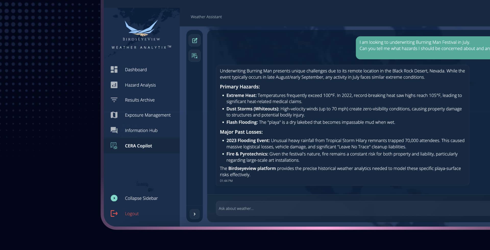 CERA® unifies hazard modelling, exposure analytics, and real-time catastrophe event forecasts into one fast, intuitive platform.